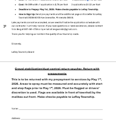 LeRay Township20598 631st AveJanesville, MN 56048 507-995-4823 [email protected] March 11th, 2026 Subject: Road Stabilization and Dust Control Program – Prepayment… Read More