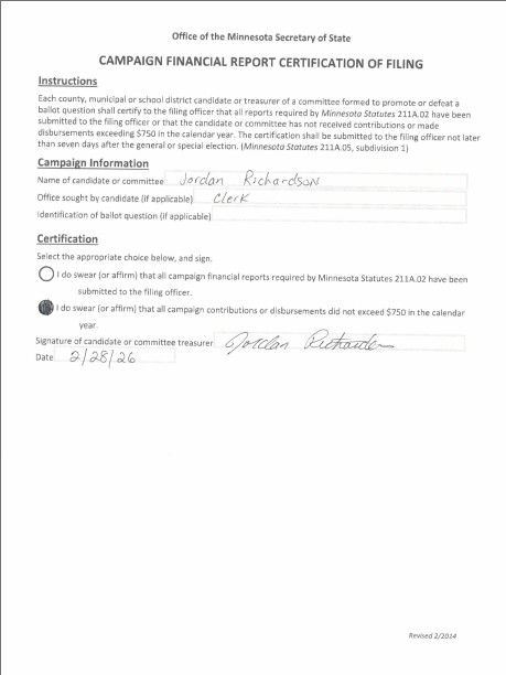 Campaign Financial Report Certification Jordan Richardson
